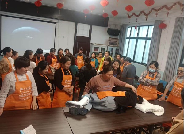 活动当天,在新村社区党群服务中心活动室,培训讲师以“理论+演示”为居民及志愿者进行培训,围绕老人起居照料、慢性病护理、应急处理等,讲解翻身、喂饭、测血压等技能,现场用真人模拟演示并手把手给予指导。