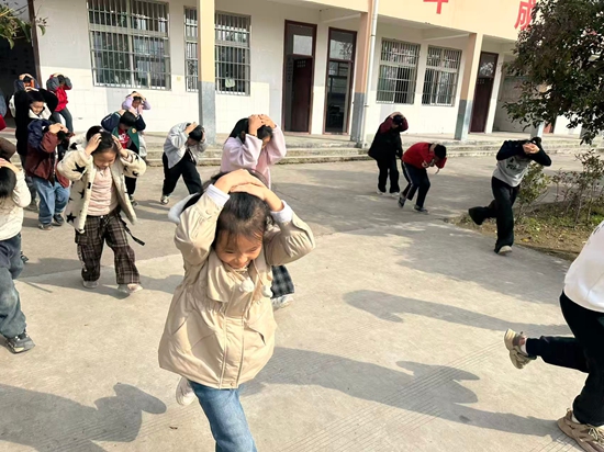 随着第一声警报响起,演练正式开始。正在上课的师生迅速反应,指导学生就近躲避在课桌下,双手护头,蜷缩身体,利用课桌、书包等物品保护好要害部位。教室内秩序井然,同学们冷静且快速地完成避险动作。约7秒后,第二声警报拉响,这是疏散信号。师生们按照预定的疏散路线,用手或书本护住头部,弯腰低姿态,迅速而有序地向操场等安全区域撤离。在疏散过程中,各楼梯口、走廊等关键位置都有教师维持秩序,保障学生安全撤离,防止出现拥挤、踩踏等情况。