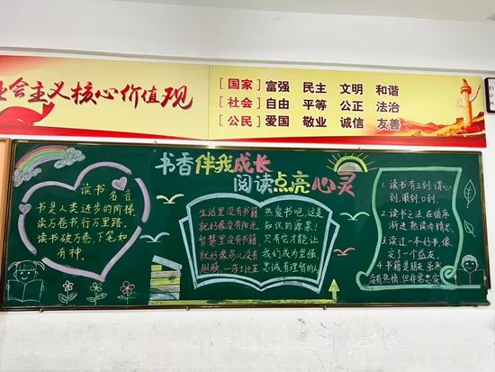 经过师生们的共同努力,一幅幅主题鲜明、内容丰富、形式多样的黑板报精彩呈现。二年级以“小手拉大手 绿色低碳我先行”主题黑板报中,画面色彩斑斓,有可爱的装饰图案,传达出环保理念。五年级以“心怀感恩与爱”主题黑板报,内容强调感恩的重要性,感恩老师给予的动力、方向与翅膀,体现出学生对老师的敬爱与感恩之情。六年级以“书香伴我成长 阅读点亮心灵”主题黑板报,营造出浓厚的书香氛围,鼓励同学们多读书、读好书。