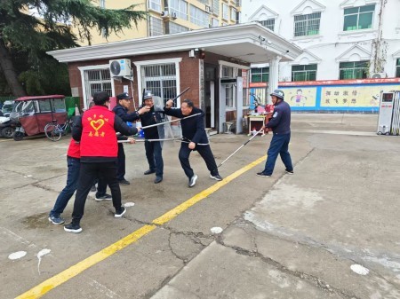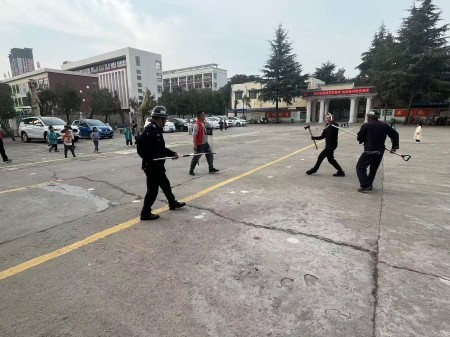 演练中,一“歹徒”手持凶器闯入校园,面对突发情况,门卫保安快速反应,手握安保器械,以最快的速度冲向事发地点,分工明确,一边向学校领导发出紧急警报,一边冷静地观察现场局势,寻找最佳的处置时机,他们凭借着专业的训练和丰富的经验,手持反恐器械,密切配合,迅速采取行动,将“歹徒”有效控制,将危险遏制在萌芽状态,确保了校园师生的安全。
