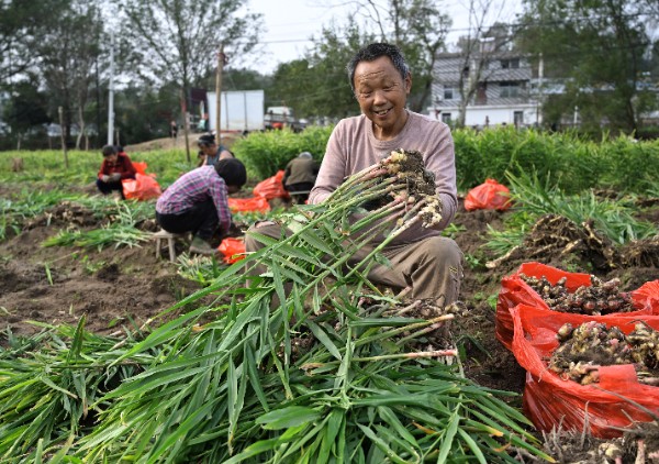 11月3日,新县金兰山街道的小黄姜种植基地一片繁忙,300亩姜田迎来丰收。田间地头,农户们弯腰忙碌,从湿润的泥土中挖出金黄饱满的小黄姜。他们动作娴熟地抖落根须上的泥土,剪去茎叶,再将鲜姜整齐地装入袋中,现场洋溢着丰收的喜悦。