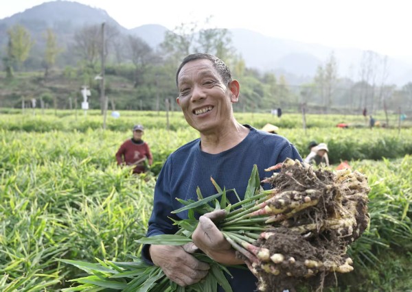 据了解,该基地通过精细化的田间管理,小黄姜长势均匀、块形饱满,预计总产量可达150万斤,总产值约600万元。小黄姜种植产业的发展,不仅绘就了一幅“姜”兴富农的金色画卷,更通过技术指导、就地用工等方式,有效带动了周边农户参与并受益,成为了特色农业助推乡村产业振兴的“金钥匙”。
