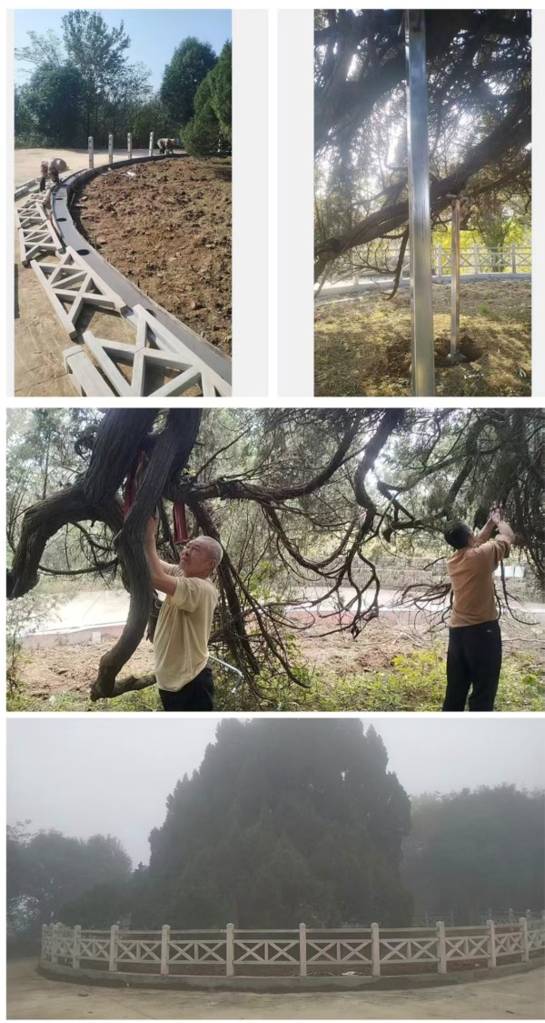 施工期间,工人们小心翼翼地对古树进行了枯枝修剪和伤口治疗。同时,项目还重建了树池围栏,清理了杂灌杂草,科学地进行了松土施肥和浇水,并增设了专业的支撑架与排水设施,为古树创造了更优越的生长环境。“这棵树看着我们一代代人长大,感情深得很。现在镇上花这么大力气保护它,大家都说好!”一位在附近居住的老村民感慨道。