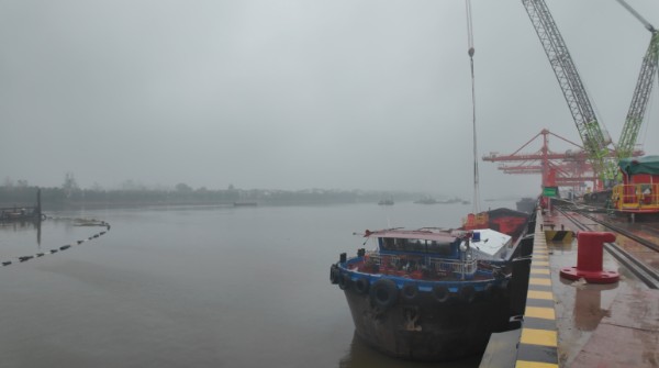 在周口港小集作业区码头,一艘装载岸桥设备的千吨级货船稳稳停靠。本批设备采用“工厂—码头”直达运输模式,减少中转环节,有效节约运输时间与成本。尽管天空飘着细雨,上海振华的安装工人们依然操控大型起重设备,紧张有序地从货船上吊卸设备。这台新抵港的岸桥外伸距达30米,较前五台更大,功能更强,可用于船-船过驳及并船作业,进一步提升码头装卸效率。