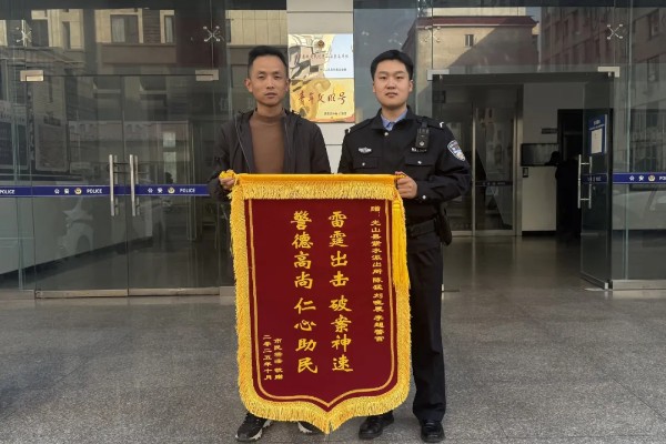 11月4日,杨某特意制作了一面写有“雷霆出击 破案神速 警德高尚 仁心助民”的锦旗,亲手送到紫水派出所民辅警手中,以示谢意。