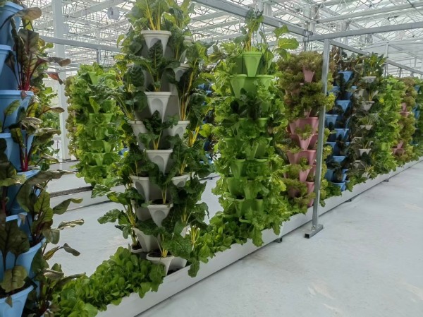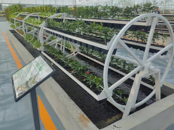 前行,现代农业产业园的玻璃温室在秋光中格外醒目。推开大门,满目生机扑面而来,旋转水培系统上,辣椒挺立枝头;托塔式栽培架间,芹菜青翠欲滴;整齐排列的卡盆里,生菜与叶甜菜交织成鲜翠欲滴的立体织锦。一旁的江南型日光大棚里,螺丝椒果实累累,玉女黄瓜悬垂枝蔓,勃勃生机与室外的静谧秋色相映成趣。