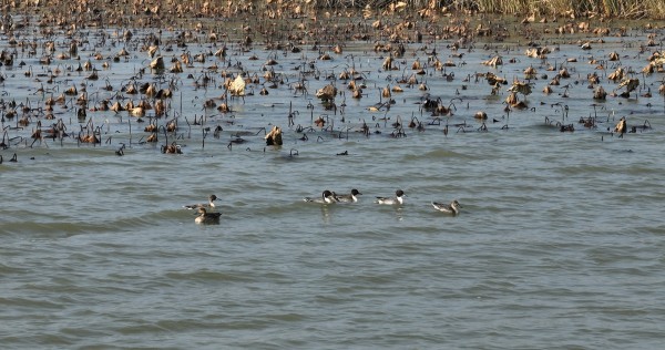 记者观测到,这四种野鸭多呈成群分布状态:既有三五只的小群,也有几十只的大群,部分群体还会相互混群。它们在水面上游弋、嬉戏、觅食。