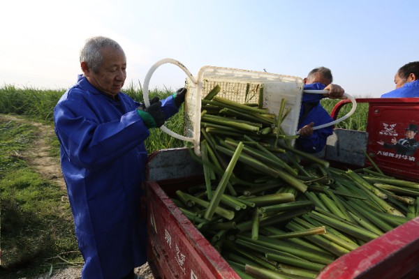 “我们乡种的茭白品质没得说,外形漂亮,口感清甜,市场上很认可。外地客商催单信息一个接一个,田里的茭白,还没摘下来,就已经被预订一空了,根本不愁销。今天我们刚采摘下来的一万两千斤茭白,马上就要装车发走。”张集乡高寨村村干部、茭白仓储分拣交易中心负责人吕关钰激动地说。