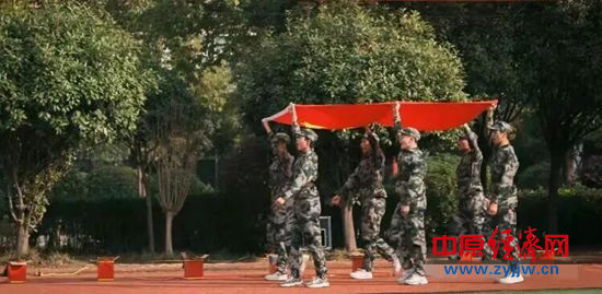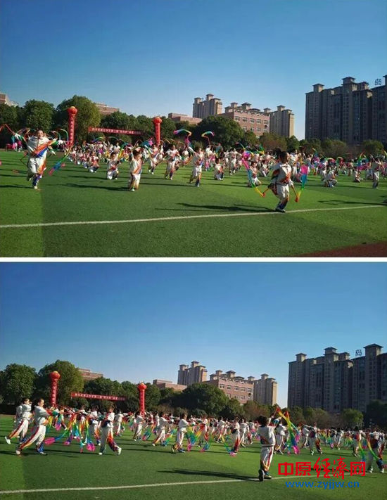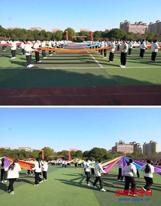 赤橙黄绿青蓝紫,谁持彩练当空舞。五彩缤纷的彩绸是青春的底色!红的热烈,紫的浪漫,蓝的深邃。一群身着统一校服的七年级的学子,手持闪耀着绚丽的彩绸,脸上洋溢着自信与喜悦的笑容,这一刻,彩绸成了充满魔法的颜料。一会儿组成万条倾泻而下的瀑布,一会儿旋转交织汇聚成一朵朵鲜花,一会儿变换成流动的云霞,像一群洁白的天使,像滑翔的大雁,所有彩绸,最终组成“奋进”二字!