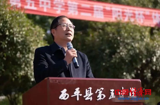 西平县教育局党组书记、局长陈亮在开幕式上致辞。他首先向为本届运动会付出辛勤努力的全体师生表示衷心感谢。陈亮局长指出,运动会不仅是一场体育竞技的盛会,更是对学校素质教育成果、师生精神风貌和同学们身心素质的一次全面检阅。他希望同学们发扬“更快、更高、更强、更团结”的奥林匹克精神,在赛场上挥洒青春、奋勇拼搏,赛出风格、赛出水平;同时要求全体裁判员与工作人员恪尽职守、公正执裁,各班主任老师精心组织、全力做好后勤保障与精神引领工作,并再次重申“安全第一、友谊第一”的根本原则。他期待学校能以此次运动会为契机,将拼搏与协作的体育精神深度融入日常教学,让运动成为校园的动人风景,让健康成为师生的鲜明特质,从而将第五中学建设成一所全面发展、特色鲜明、受人尊敬的品牌学校。最后,陈亮预祝本届运动会取得圆满成功,祝愿全体运动员取得优异成绩。