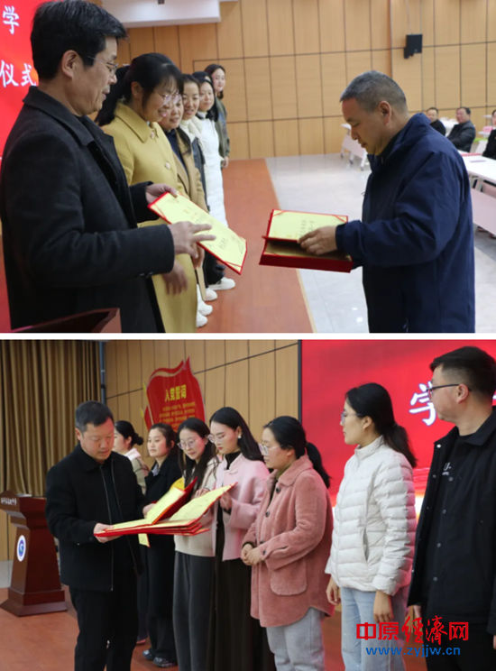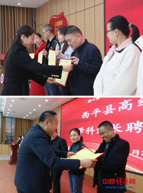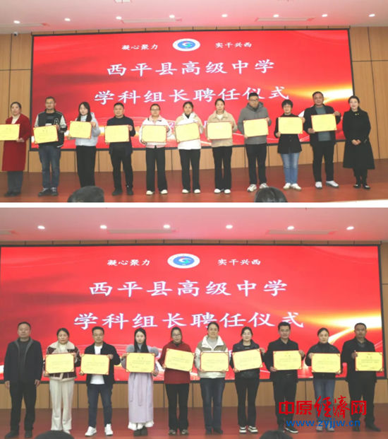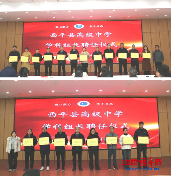 随后,西平县教育顾问、西平高中名誉校长石敬凯,党委副书记毛蕾,党委委员、副校长陈苗,副校长田冀峰,党委委员、工会主席赵汉东,校长助理张照阳分别为各学科新聘教研组长、备课组长及副组长颁发聘书。