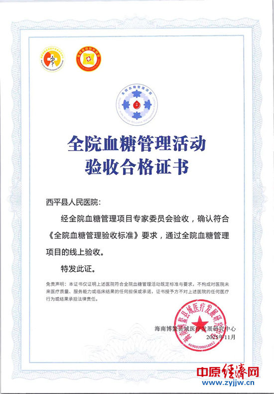 中原经济网驻马店讯(记者 杨晓 全媒体记者 冯占华 通讯员 刘晓凤 王爽 武光伟)近日,西平县人民医院传来振奋人心的喜讯:全院血糖管理项目经严格筛选正式通过验收!