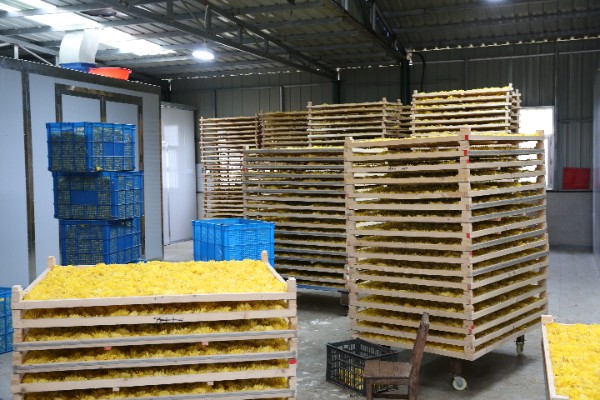 产业链条的延伸,是产业提质增效的关键。陈楼村依托村集体经济扶持资金,建成占地2000平方米的菊花深加工厂房,配齐现代化烘干、筛选、包装设备,实现从鲜菊采摘到干花加工一体化作业。目前加工厂已全面投产,日加工鲜菊100余公斤,累计产出干花6000公斤,按当前市场价核算,产值达72万元。