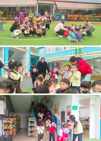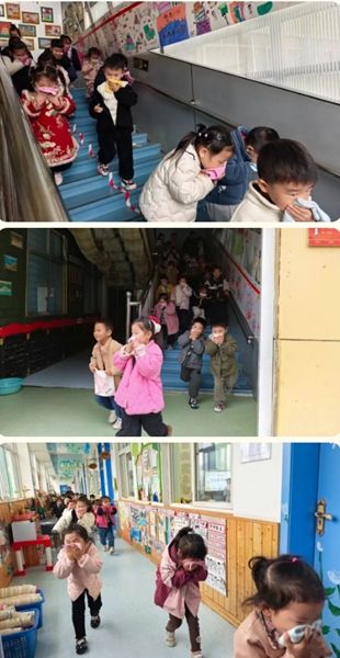 警报声骤然响起,全体教职工瞬间进入“战时状态”。各班教师临危不乱,迅速组织孩子们用湿毛巾捂住口鼻,按照预定疏散路线,弯腰低姿,快速、有序地撤离“火场”。整个过程中,孩子们冷静配合,动作规范,以最快的速度安全到达指定集结地。
