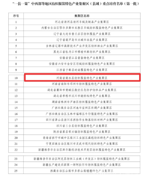 近日,工业和信息化部公布了第一批“一县一策”中西部等地区纺织服装特色产业集聚区(县域)重点培育名单,全国共有25个县域产业集聚区成功入选。周口市商水县纺织服装特色产业集聚区凭借其特色优势与产业潜力,荣列该名单之中。