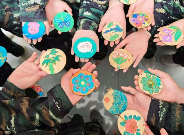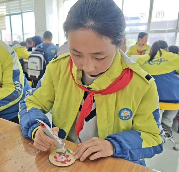 理论讲解结束,实操创作成为活动的“重头戏”。在老师的分步指导下,学生们化身“小小工匠”,严格遵循创作流程推进:先在原木牌上用画笔勾勒图稿,花鸟、卡通、美食、自然景物等创意跃然木牌;接着沿线均匀涂胶,取金丝仔细粘贴;最关键的掐丝定型环节,学生们一手持镊子固定丝线转折处,一手轻拉丝线调整弧度,力求与图稿线条完美契合。过程中,难免出现丝线歪斜、粘错位置的情况,但没有一名学生中途放弃,大家或是请教老师,或是互相支招,捋直丝线重新尝试,专注的眼神里满是对作品的期待,看着创意逐渐落地,脸上满是欣喜。