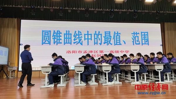 中原名师、洛阳市孟津一高副校长赵剑涛执教《圆锥曲线中求最值范围的方法》。赵老师课前深入学情,课上以奖励机制调动学生积极性,以幽默语言激活课堂氛围。他注重思想渗透与方法引领,引导学生在“练—展—思—悟”中自主构建解题体系,鲜明地体现了“输出为本”的教学理念,彰显了数学课堂的思维深度与育人温度。