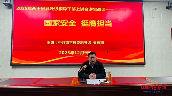 中原经济网驻马店讯(记者 杨晓 全媒体记者 冯占华 通讯员 陈学文 张亚杰)2025年12月9日,中共西平县委副书记吴振国来到西平县职业教育中心,以“国家安全 挺膺担当”为主题,为学校师生讲授了一堂主题鲜明、内容深刻的国家安全专题思想政治课。县教育局局长陈亮出席活动,校长高书军主持。