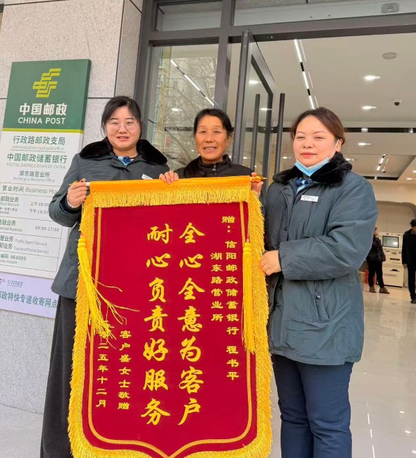 12月15日,客户盛女士专程来到中国邮政储蓄银行信阳市湖东路营业所,将一面绣有“全心全意为客户,耐心负责好服务”的锦旗,送到理财经理程书平手中,对她专业暖心的服务表示衷心感谢。