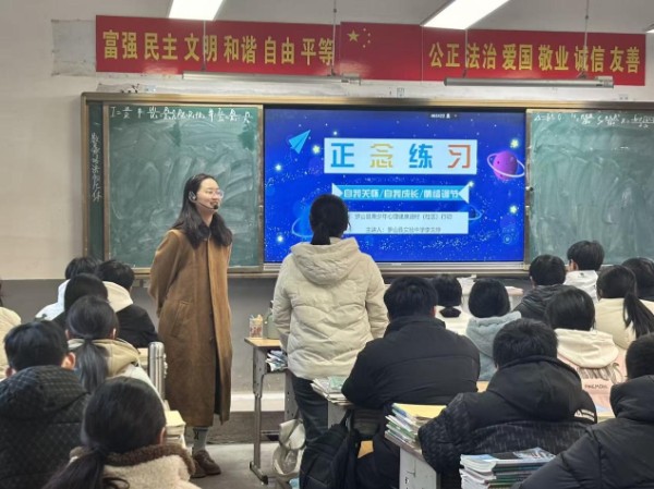活动特邀罗山县实验中学李文静老师主讲。课堂上,李老师以“正念练习”为切入点,围绕自我关怀、自我成长与情绪调节三大核心内容,通过“不会动的水”趣味互动、现场正念体验等形式,引导学生感知自身情绪变化,学习科学的情绪调节方法。李老师用生动易懂的讲解,帮助学生化解心理困惑,现场学生踊跃参与互动分享,在轻松的氛围中掌握了心理减压与情绪管理的实用技巧,活动取得良好效果。