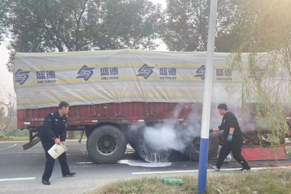 原来,杨某刚才途经光马路时,发现一辆正在行驶的大货车后轮部位闪现火苗并伴有烟雾,但货车司机并未察觉,车辆仍处于行驶状态。情况紧急!民辅警迅速作出反应,经研判货车将很快途经派出所门口,于是决定在派出所门前路段进行安全拦截。