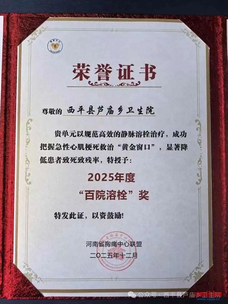 中原经济网驻马店讯(记者 杨晓 全媒体记者 冯占华 通讯员 刘华军)12月19日,河南省胸痛中心联盟颁发荣誉证书,授予西平县芦庙乡卫生院2025年度“百院溶栓”奖,以表彰卫生院在急性心肌梗死静脉溶栓治疗中的规范操作与高效救治能力。