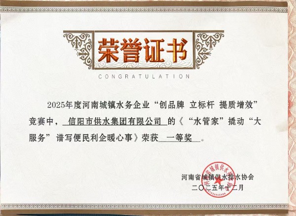 近日,在河南省城镇供水排水协会主办的2025年度河南城镇水务企业“创品牌 立标杆 提质增效”竞赛中,信阳市供水集团有限公司报送的优秀服务实践案例及品牌凭借硬核的服务实力与亮眼的民生实绩,从全省众多水务品牌中脱颖而出,斩获竞赛一等奖,彰显了信阳供水服务在全省行业内的标杆地位。