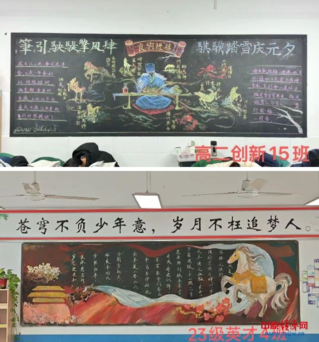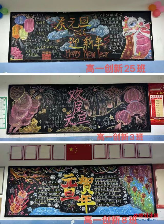 中原经济网驻马店讯(记者 杨晓 全媒体记者 冯占华 通讯员 赵大磊 张炳灿)时光荏苒,岁律更新。为迎接元旦佳节,营造温馨喜庆的校园氛围,丰富同学们的课余生活,西平县杨庄高中举办“迎元旦”主题黑板报评比活动。各班同学以笔为媒、以纸为卷,将对新年的憧憬与祝福融入方寸黑板,绘就了一幅幅色彩斑斓、创意十足的青春画卷。