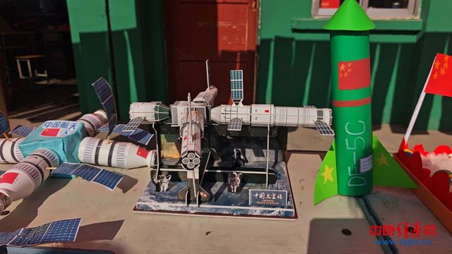 布展工作于开展前精心筹备,各班学生在班主任老师和王丹、李海霞老师的指导下,将教学楼打造成兼具传统韵味与现代活力的展示空间。展区按“非遗传承”“新年手作”“科技创意”三大主题分区陈列。非遗展区内,剪纸、拓印、书法等作品琳琅满目;新年手作区的糖葫芦、七彩烟花、八骏送福等展品凭借浓郁的年味、灵动的创意成为焦点;科技展区的空间站、东风—5C、编程控制装置等作品各具巧思,尽显学生的探索精神与实践能力。