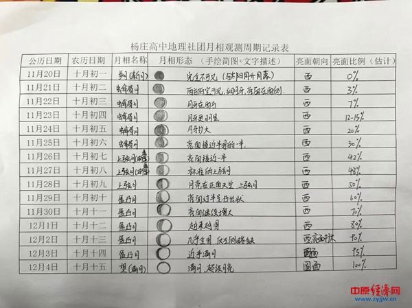 活动初期,指导老师开展了月相知识讲解,为观测打下理论基础。同学们利用晴好夜晚,持续追踪月相变化。从农历十月初一不可见的新月,到日渐丰盈的蛾眉月、轮廓清晰的上弦月,直至最终成功观测到本年度第二大“超级月亮”。地理社团的同学们分析月相变化与农历日期、观测时间的关系,用心描绘了每日月亮的形状、亮面比例和方位并完成了《月相观测记录表》。