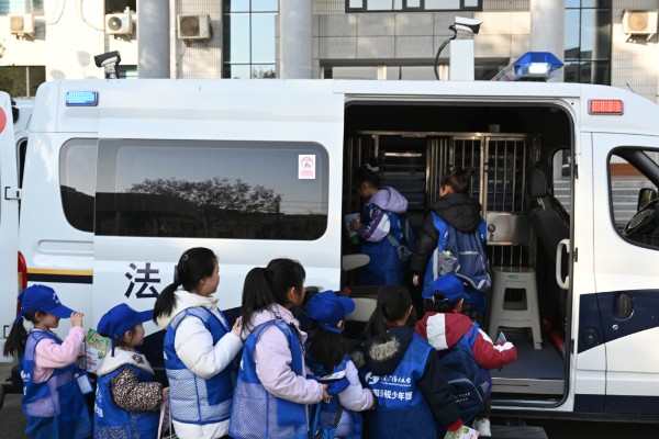 停放在院内的法院专用警车,成为孩子们探索司法奥秘的“新阵地”。法警队员耐心讲解警车的特殊功能、内部构造及与普通车辆的本质区别,带领孩子们分批有序登车参观。通过直观观察与实地感受,孩子们真切体会到司法执行的严肃性与规范性,深刻认识到“法律红线不可逾越”,进一步树立起尊法守法的自觉意识。