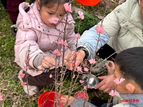 制作过程中,孩子们两两协作、互相帮助,有的专注地蘸取蜡液,有的仔细调整“花瓣”的位置,还有的踮起脚尖将蜡花点缀在更高的枝丫上。指尖的创意在自然中绽放,一张张稚嫩的脸上满是认真与喜悦。当看到自己制作的蜡花挂满枝头,孩子们纷纷露出了自豪的笑容,现场充满了欢声笑语。