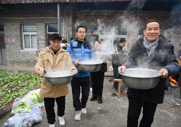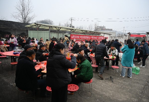 1月17日,新县八里畈镇七龙山胡记广场炊烟袅袅、腊香四溢,村民郑春魁将自家散养的黑猪端上年宴,邀请全村200余名乡亲共享年味儿。