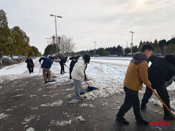 活动现场,干部职工们手持铁锹、雪铲等工具,以饱满的热情投入清雪工作。大家分工协作、默契配合,有的奋力铲除路面坚冰,有的合力清扫主干道积雪,有的细致清理人行道缝隙中的残雪,重点对单位周边道路、公共通行区域及易滑路段进行全面清扫。凛冽寒风中,忙碌的身影构成了冬日里最动人的风景线,每一次挥锹铲雪都饱含着对群众出行安全的牵挂,每一段畅通道路都凝聚着气象人的责任与担当。