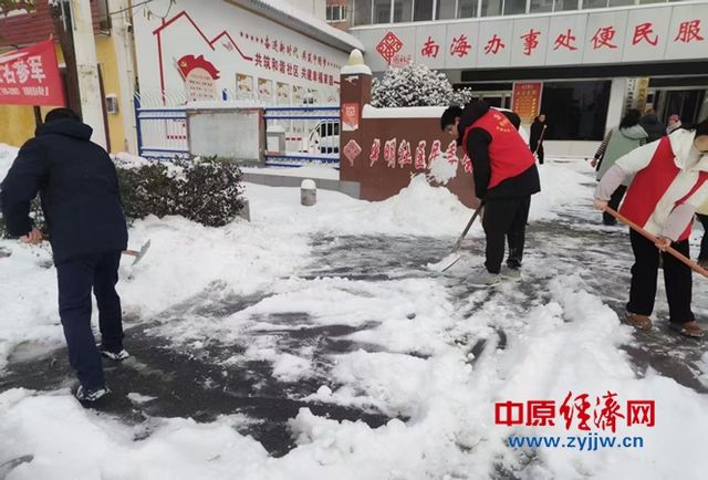 中原经济网驻马店讯 (记者 杨晓 全媒体记者 晨曦 通讯员 朱荣欣)近日,受强冷空气影响,驻马店市迎来强降雪天气,社区周边道路出现积雪,给居民进出带来不便,为及时消除安全隐患,保障居民安全通行,驻马店市驿城区南海街道光明社区迅速组织工作人员及辖区志愿者,对社区门口及周边主要通道开展了集中扫雪除冰行动。