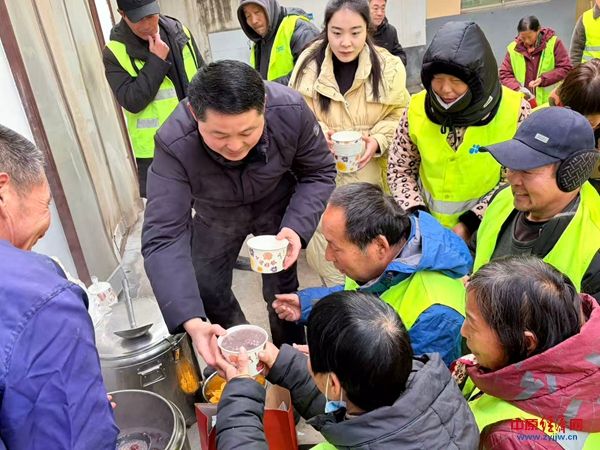 在礼品发放环节,书记任立刚、镇长康俊伟与其他镇领导一同走上前,逐一为环卫工人递上暖心礼品,反复叮嘱大家在坚守岗位的同时,务必做好防寒防护,注意自身安全。随后,任书记亲手为在场的每一位环卫工人盛上热气腾腾的腊八粥,“趁热喝,暖暖身子!”一句句亲切地叮嘱,一碗碗香甜的热粥,让环卫工人脸上洋溢起幸福的笑容,也让这个寒冬充满了暖意。