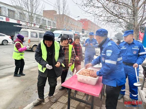 清晨七点,粥香弥漫在盆尧镇的街头,闻讯而来的群众和环卫工人陆续排起了队。志愿者们一边热情地为大家盛粥递蛋,一边送上节日的问候。“天这么冷,喝上一碗热粥,心里头暖烘烘的!”环卫工人张师傅捧着粥碗,脸上洋溢着满足的笑容。活动现场不仅有暖心的热粥,志愿者们还准备了鸡蛋、馒头等食物,让大家在暖胃的同时更能感受到实实在在的关怀。