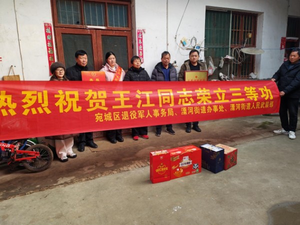 1月27日上午,宛城区退役军人事务局双拥办主任曾庆岑一行前往溧河街道邢庄村,走访慰问现役军人王江的家属,为他们送上王江在部队荣立三等功的喜报及节日问候。