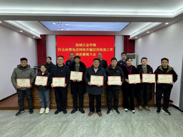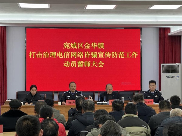 为扎实落实上级反诈工作部署,压紧压实工作责任、凝聚全民反诈合力,1月27日,宛城区金华镇召开打击治理电信网络诈骗宣传防范工作动员誓师大会,全面吹响全民反诈攻坚“集结号”。南阳市公安局宛城区公安分局反诈中心主任杨正勇参会,金华镇党政班子成员、各村负责人、治保主任,以及镇派出所民警和辖区网络达人、自媒体工作者等齐聚一堂,共商反诈举措、共筑防诈防线。