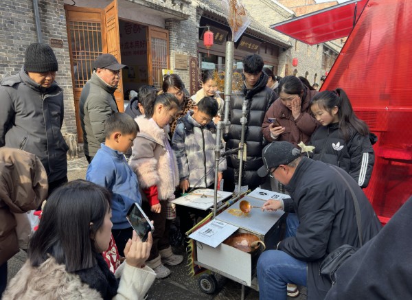 在非遗展示区,糖画、麻绳编织等传统技艺的传承人现场“秀”绝活,吸引了众多市民驻足观看;在年货大集,来自各地的特色美食吸引着游客驻足品尝。人们漫步在古色古香的街巷中,纷纷用相机拍照留念。