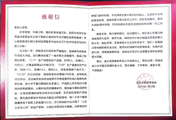 近日,息县公安局收到一封来自信阳市烟草专卖局的感谢信,信中对息县公安局食药环部门在打击涉烟违法犯罪工作中的担当作为与突出贡献给予了高度肯定和诚挚感谢。