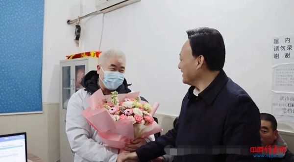 在医院中医科诊室,侯公涛向沈长坡医生送上了节日花束,对他长期以来为西平县中医药事业发展及群众健康作出的贡献表示感谢。