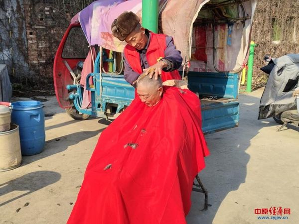 免费理发区里,志愿者细致修剪、耐心服务,为老年村民打理清爽发型,赢得阵阵好评。