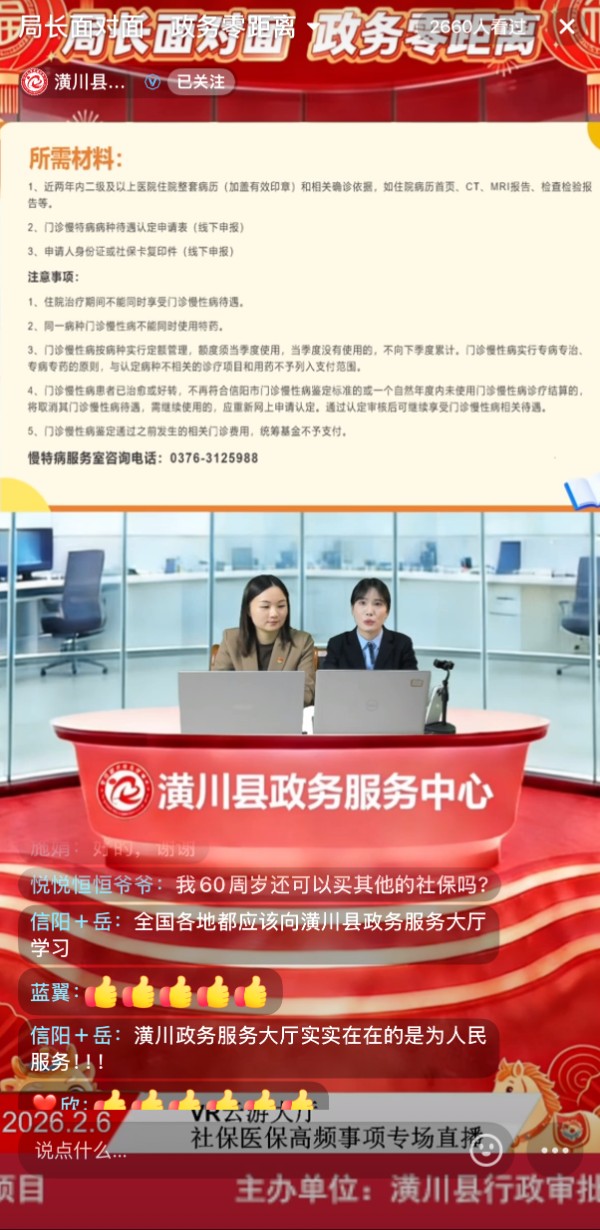 聚焦“高效办成一件事”核心目标,潢川县政务服务中心主动迭代服务模式,创新开展“局长面对面・政务零距离”专题互动直播。县行政审批和政务信息管理局副局长王豫宁以“首席政务导览官”身份,带领公众沉浸式漫游VR全景政务服务大厅,通过实时互动精准回应社保、医保等高频民生诉求,将传统办事指引升级为可感、可知、可互动的智慧服务新体验,为“高效办成一件事”注入数字化、人性化新动能。