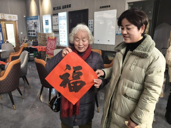 写春联区域里,书法老师们凝神执笔、挥毫泼墨,笔锋流转间,一副副寓意吉祥的春联、一个个遒劲有力的“福”字跃然红纸上,“喜居宝地千年旺,福照家门万事兴”等美好寄语,饱含着对新年的美好期许。社区工作人员在一旁贴心协助铺纸研墨、整理作品,将写好的春联和“福”字一一送到居民手中。“手写的春联才有年味儿,社区和物业把年俗送到家门口,心里暖乎乎的!” 接过大红“福”字的张奶奶笑容满面,连连称赞。