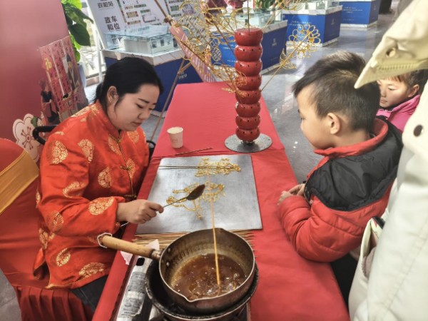 非遗糖画区域则成为孩子们的欢乐天地。身着传统红装的非遗艺人手持长勺,以熬制好的金黄糖稀为墨,在石板上快速勾勒。手腕轻转间,骏马、龙、兔子等栩栩如生的造型便成型了,冷却后粘上竹签,一支支晶莹剔透的糖画让孩子们目不转睛。“我要那个马的糖画,今年是马年!”小朋友们拿着心仪的糖画,甜滋滋的笑容挂在脸上。家长们纷纷拿出手机记录这温馨瞬间,现场洋溢着童真与欢乐。