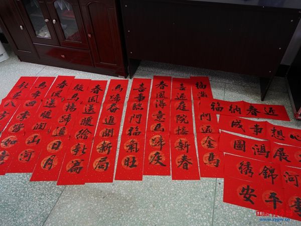 活动现场,书法家们凝神聚气、挥毫泼墨,将真诚的祝福付诸笔端,引来围观干警们称赞不已。一副副吉祥寓意的新春对联,一个个饱含神韵的“福”字跃然纸上,散发浓浓墨香,传递温暖祝福。