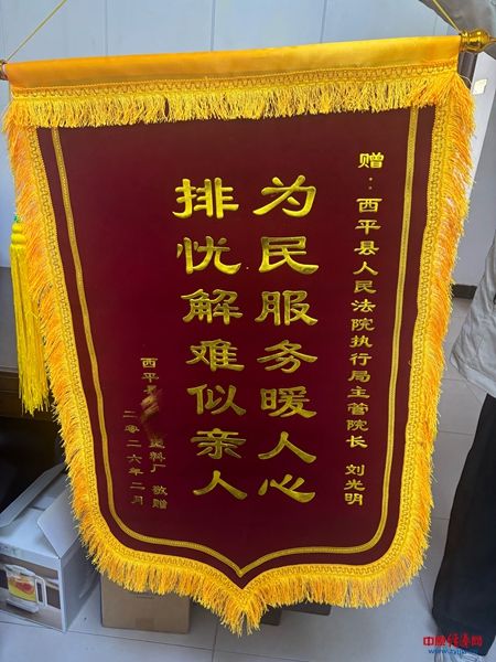 中原经济网驻马店讯(记者 杨晓 全媒体记者 冯占华 通讯员 杨斐)近日,西平县某塑料厂将三面满载谢意的锦旗送到了西平县人民法院分管执行局副院长刘光明、执行干警梅泽宇、武星手中,这是企业对法院高效执行、倾力保障市场主体合法权益的充分肯定。