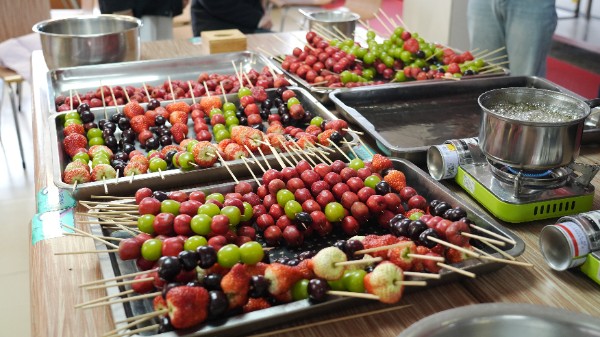 另一边的手做糖葫芦区域,洋溢着甜蜜与欢笑。干警和孩子们一起动手,将洗净的山楂、草莓、葡萄等水果仔细串成串,熬糖、蘸糖、冷却……一道道工序在合作中完成。晶莹剔透的糖衣包裹着鲜红的水果,一串串糖葫芦犹如红宝石般诱人。