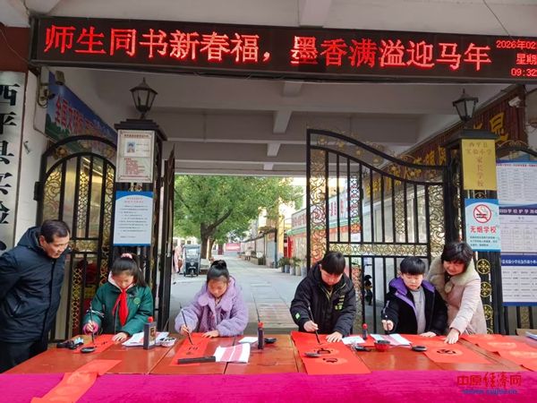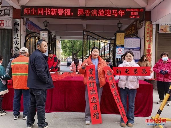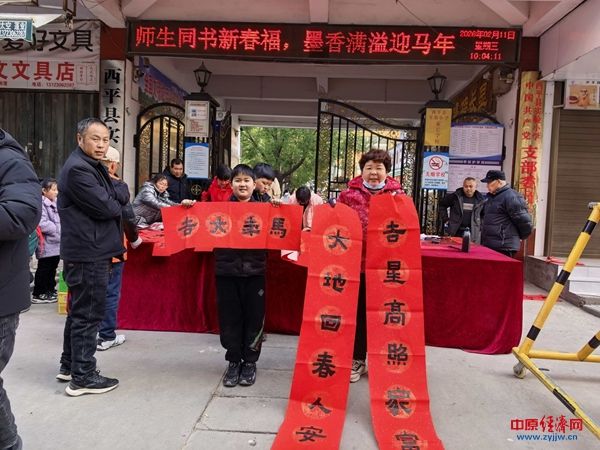 中原经济网驻马店讯(记者 杨晓 全媒体记者 冯占华 通讯员 于丽娜)以笔墨为媒,以祝福为桥,为将中华优秀传统文化的馨香与新春的祝福送到群众手中,2月11日,西平县实验小学在学校门口举行迎新春师生义写春联主题活动。学校校长李艳及领导班子成员与师生共同传递新春祝福,现场暖意融融、年味十足。